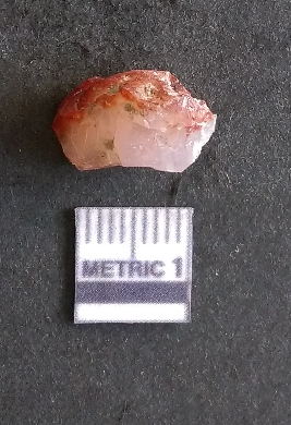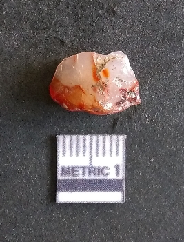 | Description / विवरण | The carnelian flake is reddish in color, with sharp flakes edges and a small bulb of percussion owing to knapping activity. |