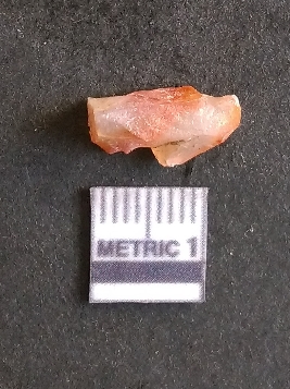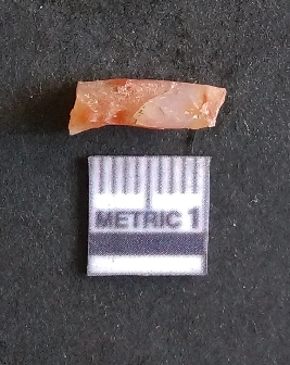 | Description / विवरण | The carnelian flake is reddish in color, with sharp flakes edges and a small bulb of percussion owing to knapping activity. |
