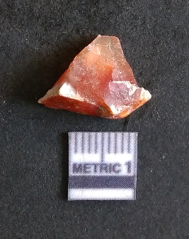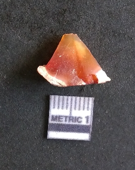 | Description / विवरण | The carnelian flake is reddish in color, with sharp flakes edges and a small bulb of percussion owing to knapping activity. |