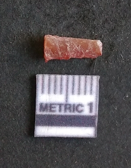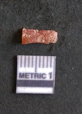 | Description / विवरण | The carnelian flake is reddish in color, with sharp flakes edges and a small bulb of percussion owing to knapping activity. |