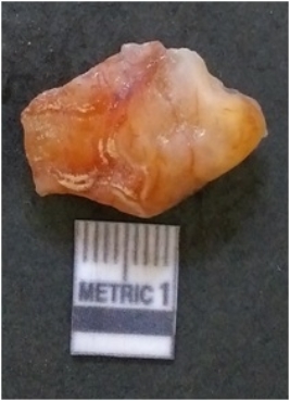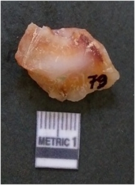 | Description / विवरण | It is chalcedony flake, translucent in appearance. The piece shows sharp pointed ends and flake scars on the surface as a result of flaking. The piece shows a bulb of percussion. |