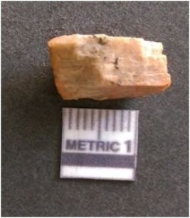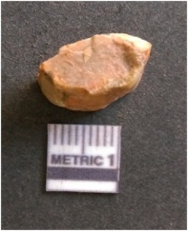 | Description / विवरण | The chert piece is dark in color, with a prominent bulb of percussion and sharp flaked edges. The piece is a part of lithic debitage or raw material for lithic knapping. The piece shows clear ripple marks and bulb of percussion. |