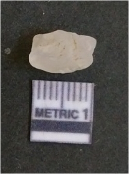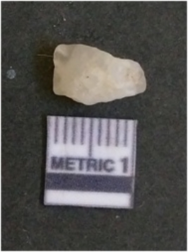 | Description / विवरण | The quartz flake has sharp flaked edges and pointed ends as a result of flaking. The piece is semi-transparent in nature with irregular fracture pattern. The piece is roughly triangular in shape and has a prominent bulb of percussion. |