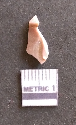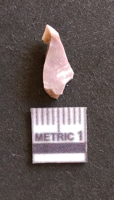 | Description / विवरण | The chert piece is dark in color, with a prominent bulb of percussion and sharp flaked edges. The piece is a part of lithic debitage or raw material for lithic knapping. |