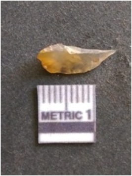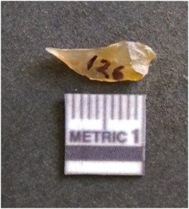 | Description / विवरण | It is chalcedony flake, translucent in appearance. The piece shows sharp pointed ends and flake scars on the surface as a result of flaking. The piece shows a bulb of percussion. |