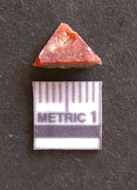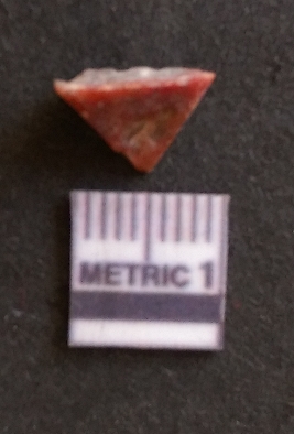 | Description / विवरण | The chert piece is dark in color, with a prominent bulb of percussion and sharp flaked edges. The piece is a part of lithic debitage or raw material for lithic knapping. |