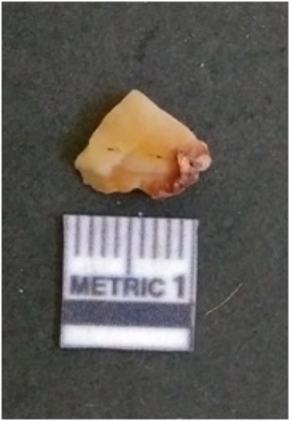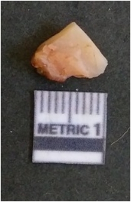 | Description / विवरण | The quartz flake has sharp flaked edges and pointed ends as a result of flaking. The piece is semi-transparent in nature with irregular fracture pattern. The piece is roughly triangular in shape and has a prominent bulb of percussion. |