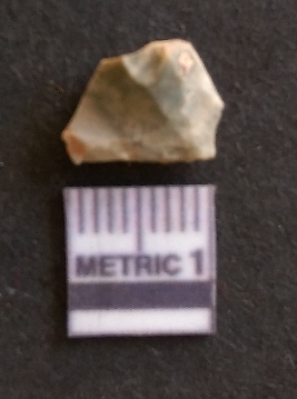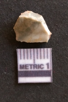 | Description / विवरण | The chert piece is dark in color, with a prominent bulb of percussion and sharp flaked edges. The piece is a part of lithic debitage or raw material for lithic knapping. |