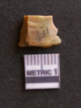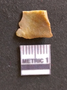 | Description / विवरण | The chert piece is dark in color, with a prominent bulb of percussion and sharp flaked edges. The piece is a part of lithic debitage or raw material for lithic knapping. |
