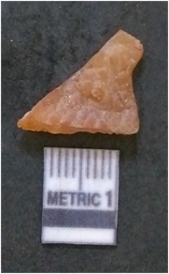| Description / विवरण | It is chalcedony flake, translucent in appearance. The piece shows sharp pointed ends and flake scars on the surface as a result of flaking. The piece shows a bulb of percussion. |