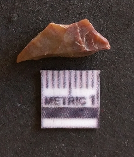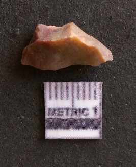 | Description / विवरण | The chert piece is dark in color, with a prominent bulb of percussion and sharp flaked edges. The piece is a part of lithic debitage or raw material for lithic knapping. |