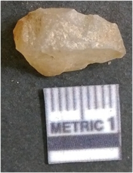 | Description / विवरण | It is chalcedony flake, translucent in appearance. The piece shows sharp pointed ends and flake scars on the surface as a result of flaking. The piece shows a bulb of percussion. |