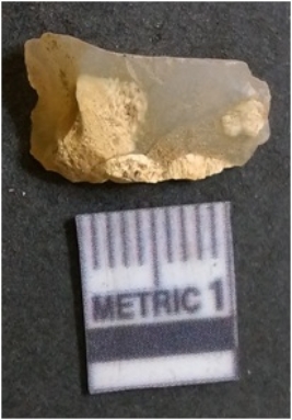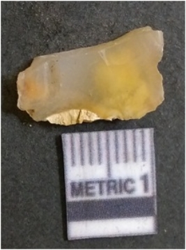 | Description / विवरण | It is chalcedony flake, translucent in appearance. The piece shows sharp pointed ends and flake scars on the surface as a result of flaking. The piece shows a bulb of percussion. |