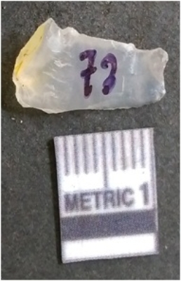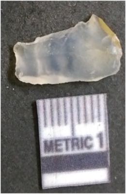 | Description / विवरण | It is chalcedony flake, translucent in appearance. The piece shows sharp pointed ends and flake scars on the surface as a result of flaking. The piece shows a bulb of percussion. |