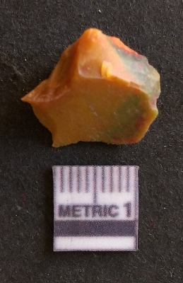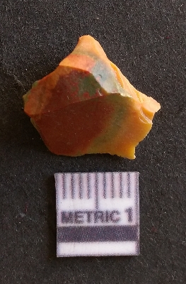 | Description / विवरण | The chert piece is dark in color, with a prominent bulb of percussion and sharp flaked edges. The piece is a part of lithic debitage or raw material for lithic knapping. |