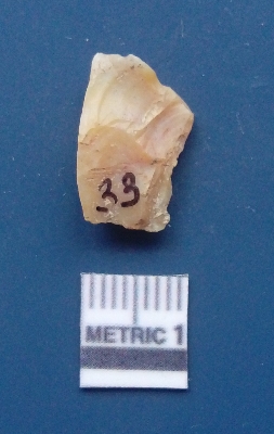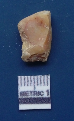 | Description / विवरण | The chert piece is dark in color, with a prominent bulb of percussion and sharp flaked edges. The piece is a part of lithic debitage or raw material for lithic knapping. The piece shows clear ripple marks and bulb of percussion. |