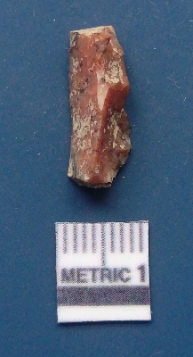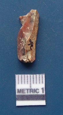 | Description / विवरण | The chert piece is dark in color, with a prominent bulb of percussion and sharp flaked edges. The piece is a part of lithic debitage or raw material for lithic knapping. The piece shows clear ripple marks and bulb of percussion. |