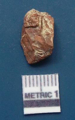 | Description / विवरण | The chert piece is dark in color, with a prominent bulb of percussion and sharp flaked edges. The piece is a part of lithic debitage or raw material for lithic knapping. The piece shows clear ripple marks and bulb of percussion. |