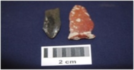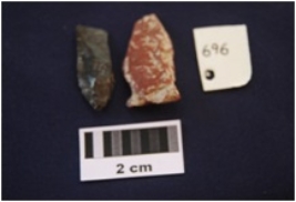 | Description / विवरण | Blades, made on chert. Among them one is broken, one has prepared platform whereas the other has narrow platform, bulb absent on ventral side. |