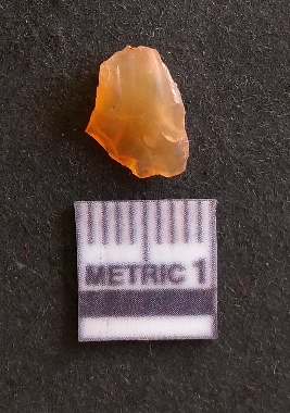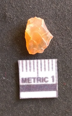 | Description / विवरण | The carnelian flake is reddish in color, with sharp flakes edges and a small bulb of percussion owing to knapping activity. |