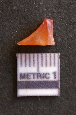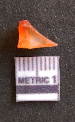 | Description / विवरण | The carnelian flake is reddish in color, with sharp flakes edges and a small bulb of percussion owing to knapping activity. |