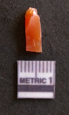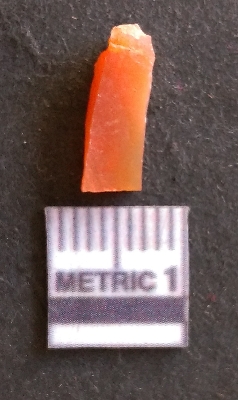 | Description / विवरण | The carnelian flake is reddish in color, with sharp flakes edges and a small bulb of percussion owing to knapping activity. |