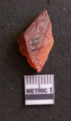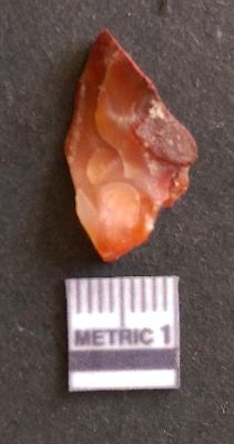 | Description / विवरण | The carnelian flake is reddish in color, with sharp flakes edges and a small bulb of percussion owing to knapping activity. |