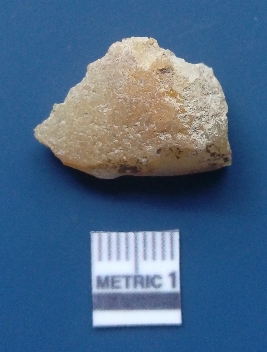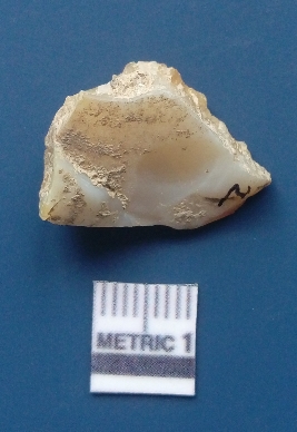 | Description / विवरण | The quartz flake has sharp flaked edges and pointed ends as a result of flaking. The piece is semi-transparent in nature with irregular fracture pattern. The piece is roughly triangular in shape and has a prominent bulb of percussion. |