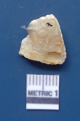 | Description / विवरण | The chert piece is dark in color, with a prominent bulb of percussion and sharp flaked edges. The piece is a part of lithic debitage or raw material for lithic knapping. The piece shows clear ripple marks and bulb of percussion. |