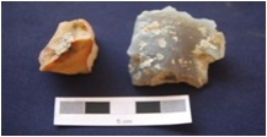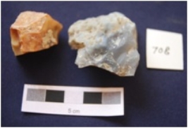 | Description / विवरण | Core and flake on Chalcedony and chert. Core with prepared platform and flake scars, flake has prepared platform, diffused bulb on ventral side, cortex on dorsal side. |