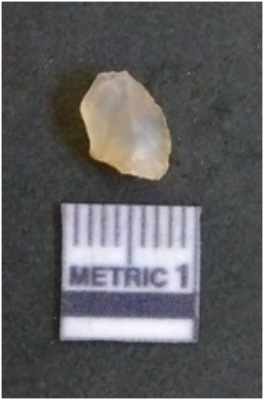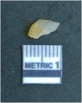 | Description / विवरण | It is chalcedony flake, translucent in appearance. The piece shows sharp pointed ends and flake scars on the surface as a result of flaking. The piece shows a bulb of percussion. |