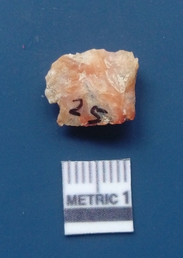 | Description / विवरण | The chert piece is dark in color, with a prominent bulb of percussion and sharp flaked edges. The piece is a part of lithic debitage or raw material for lithic knapping. The piece shows clear ripple marks and bulb of percussion. |