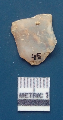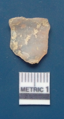 | Description / विवरण | It is chalcedony flake, translucent in appearance. The piece shows sharp pointed ends and flake scars on the surface as a result of flaking. The piece shows a bulb of percussion. |