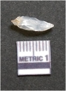 | Description / विवरण | It is chalcedony flake, translucent in appearance. The piece shows sharp pointed ends and flake scars on the surface as a result of flaking. The piece shows a bulb of percussion. |