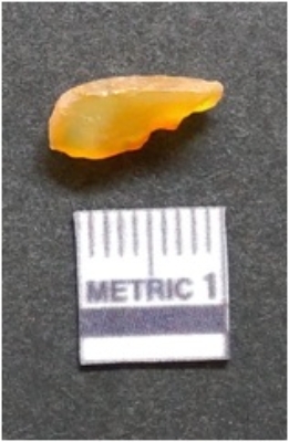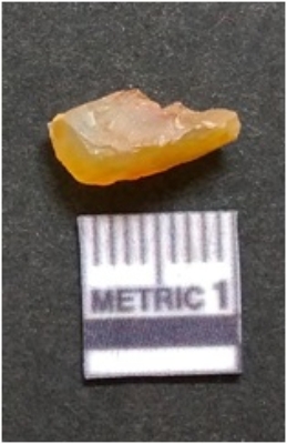 | Description / विवरण | It is chalcedony flake, translucent in appearance. The piece shows sharp pointed ends and flake scars on the surface as a result of flaking. The piece shows a bulb of percussion. |