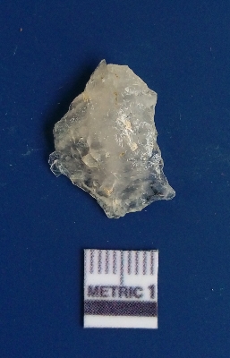 | Description / विवरण | The quartz flake has sharp flaked edges and pointed ends as a result of flaking. The piece is semi-transparent in nature with irregular fracture pattern. The piece is roughly triangular in shape and has a prominent bulb of percussion. |