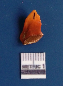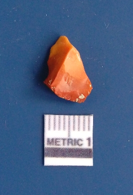 | Description / विवरण | The chert piece is dark in color, with a prominent bulb of percussion and sharp flaked edges. The piece is a part of lithic debitage or raw material for lithic knapping. The piece shows clear ripple marks and bulb of percussion. |