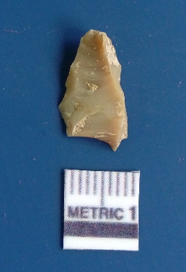 | Description / विवरण | The chert piece is dark in color, with a prominent bulb of percussion and sharp flaked edges. The piece is a part of lithic debitage or raw material for lithic knapping. The piece shows clear ripple marks and bulb of percussion. |