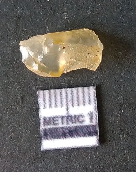 | Description / विवरण | It is chalcedony flake, translucent in appearance. The piece shows sharp pointed ends and flake scars on the surface as a result of flaking. The piece shows a bulb of percussion. |