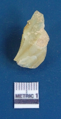 | Description / विवरण | It is chalcedony flake, translucent in appearance. The piece shows sharp pointed ends and flake scars on the surface as a result of flaking. The piece shows a bulb of percussion. |