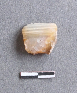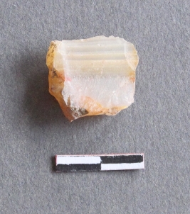 | Description / विवरण | The chalcedony flake has a prominent bulb on one end and tapering, sharp edge on the other. The piece on the roughly semi circular in shape, with a part of cortex well preserved on the piece. |
