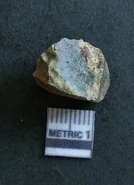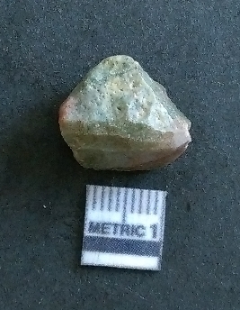 | Description / विवरण | The chert flake is pale green in colour, with flake scars on the surface. The piece is roughly triangular in shape and shows secondary flaking on the surface. |