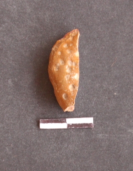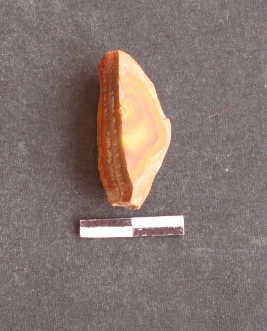 | Description / विवरण | It s a chalcedony flake, with a striking platform with bulb of percussion on the ventral side. It s orangish in color, flake edges on the surface with ripple on it due to heavy percussion. |