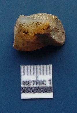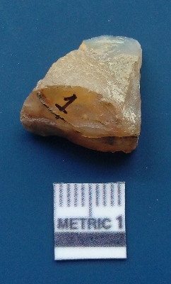| Description / विवरण | It is chalcedony flake, translucent in appearance. The piece shows sharp pointed ends and flake scars on the surface as a result of flaking. The piece shows a bulb of percussion. |