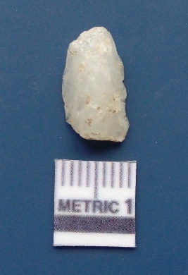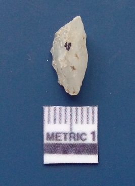 | Description / विवरण | The quartz flake has sharp flaked edges and pointed ends as a result of flaking. The piece is semi-transparent in nature with irregular fracture pattern. The piece is roughly triangular in shape and has a prominent bulb of percussion. |