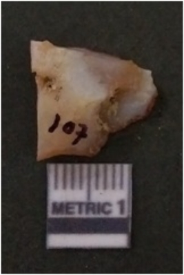 | Description / विवरण | It is chalcedony flake, translucent in appearance. The piece shows sharp pointed ends and flake scars on the surface as a result of flaking. The piece shows a bulb of percussion. |