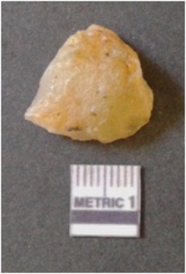 | Description / विवरण | It is chalcedony flake, translucent in appearance. The piece shows sharp pointed ends and flake scars on the surface as a result of flaking. The piece shows a bulb of percussion. |