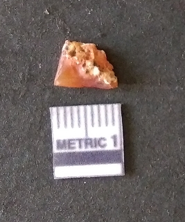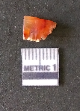 | Description / विवरण | The carnelian flake is reddish in color, with sharp flakes edges and a small bulb of percussion owing to knapping activity. |