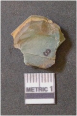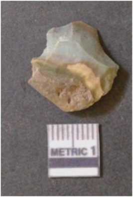 | Description / विवरण | The chert piece is dark in color, with a prominent bulb of percussion and sharp flaked edges. The piece is a part of lithic debitage or raw material for lithic knapping. The piece shows clear ripple marks and bulb of percussion. |