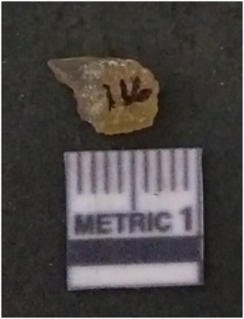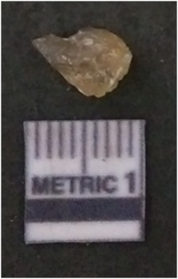 | Description / विवरण | The flake has irregular fracture pattern and sharp flaked edges as a result of lithic knapping activity. The piece is pale, with surfacial flake scars and a bulbous end. The flake is of smoky quartz variety, grayish in colour and translucent in appearance. |